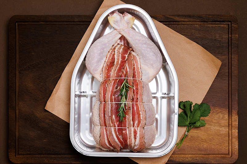 Our fresh chicken is boned, rolled and stuffed with our homemade stuffing and Heritage Ham making it both delicious and easy to carve.
